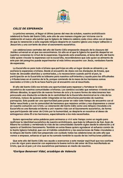 Quiero aprovechar estas palabras para animaros a vivir este tiempo como un regalo para reafirmar la identidad eucarística de nuestra archidiócesis, que bajo la influencia de San Juan de Ribera ha cuidado y vertebrado la vida de las comunidades durante siglos desde la adoración y el aprecio al Santísimo Sacramento. También en estas líneas quiero agradecer el esfuerzo común de la Santa Iglesia Catedral, que con el Cabildo catedralicio y las asociaciones de fieles vinculadas a la reliquia del Santo Cáliz han preparado con cuidado todas las celebraciones de este año que vamos a empezar, esfuerzo al que se ha sumado también la ayuda de las instituciones públicas.
