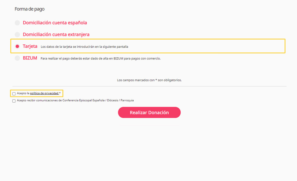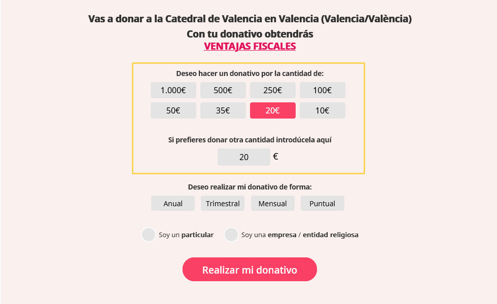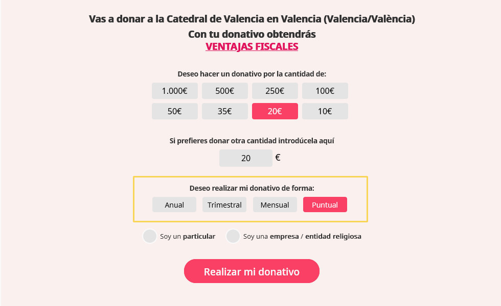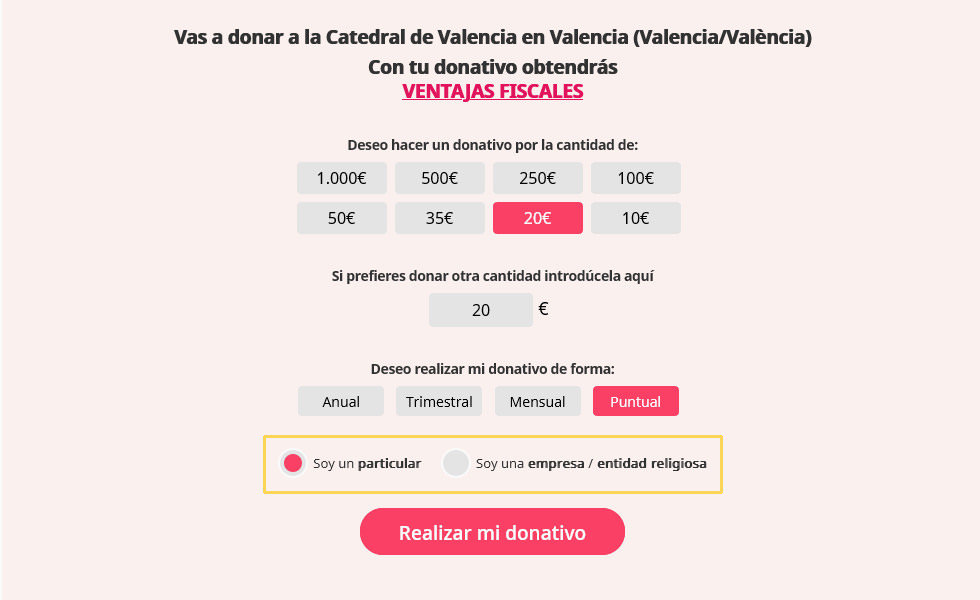 En polsar el botó "Realitzar un donatiu" sereu dirigits al portal "donoamiiglesia.es" on seguint els passos indicats podreu triar la modalitat i la quantitat que desitgeu realitzar.