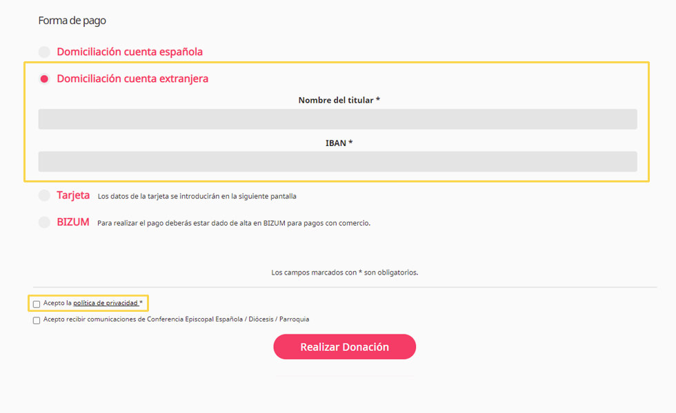 El pagament es pot realitzar a través de quatre modalitats, Domiciliació compte espanyol, Domiciliació compte estranger, Targeta i Bizum.