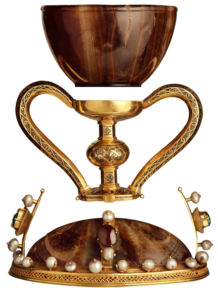 Molt més posteriors són les anses i el peu d’or finament gravat, que tanca una copa o “naveta” d’alabastre, d’art islàmic, diferent a la copa; tot això, i també les joies que adornen la base són d’època medieval.