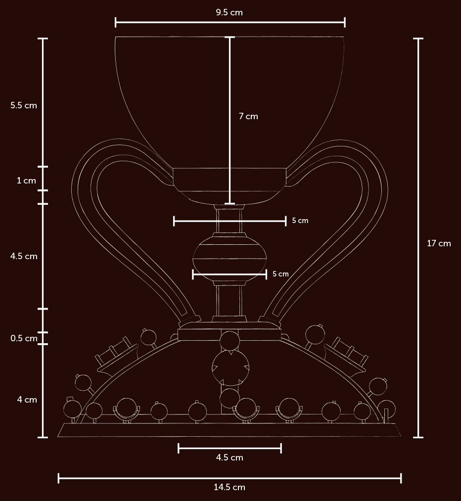 Les dimensions són modestes: 17 cm. d’alçària, 9 cm. d’amplària de la copa i 14,5 x 9,7 cm. que té la base el·líptica.