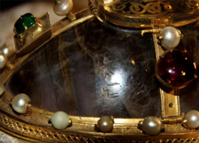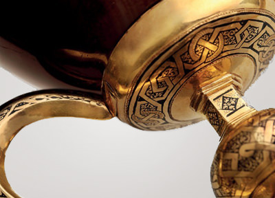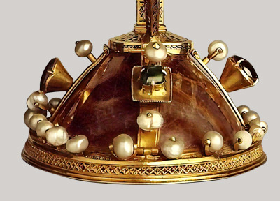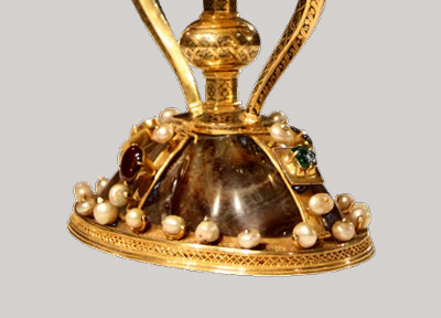Molt més posteriors són les anses i el peu d’or finament gravat, que tanca una copa o “naveta” d’alabastre, d’art islàmic, diferent a la copa; tot això, i també les joies que adornen la base són d’època medieval.