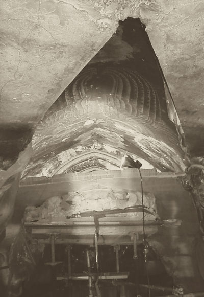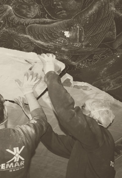 Història dels frescos de la CatedralEl Capítol va sol·licitar la restauració de les pintures i es va veure la necessitat de desmuntar la clau central de fusta daurada i les plementeries de la volta barroca, per poder accedir als frescos.