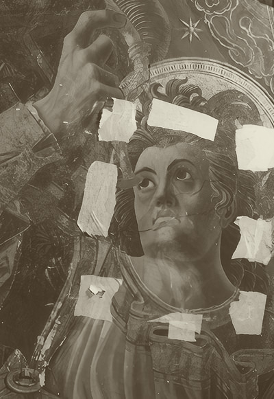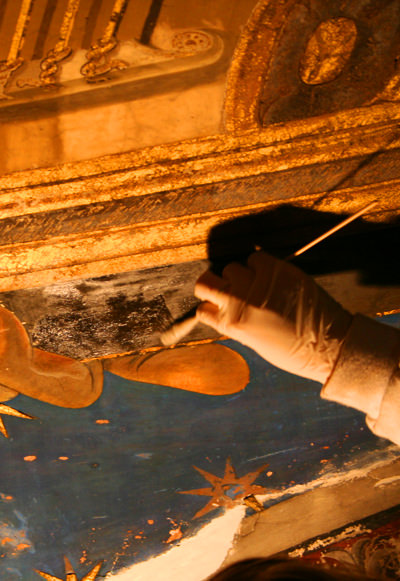 Eliminació de fongs i florits, neteja de la brutícia amb goma d’esborrar, neteja dels daurats, cobriment dels clevills i zones perdudes amb “rigatino” reversible, fixació de les parts amb risc de despreniment.