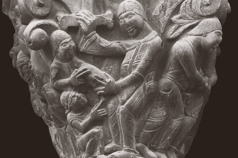 This work is a derivative of this photo: Jaca - Catedral - Portada Meridional - Capitel by Ecelan is licensed under the creative commons (BY) license.